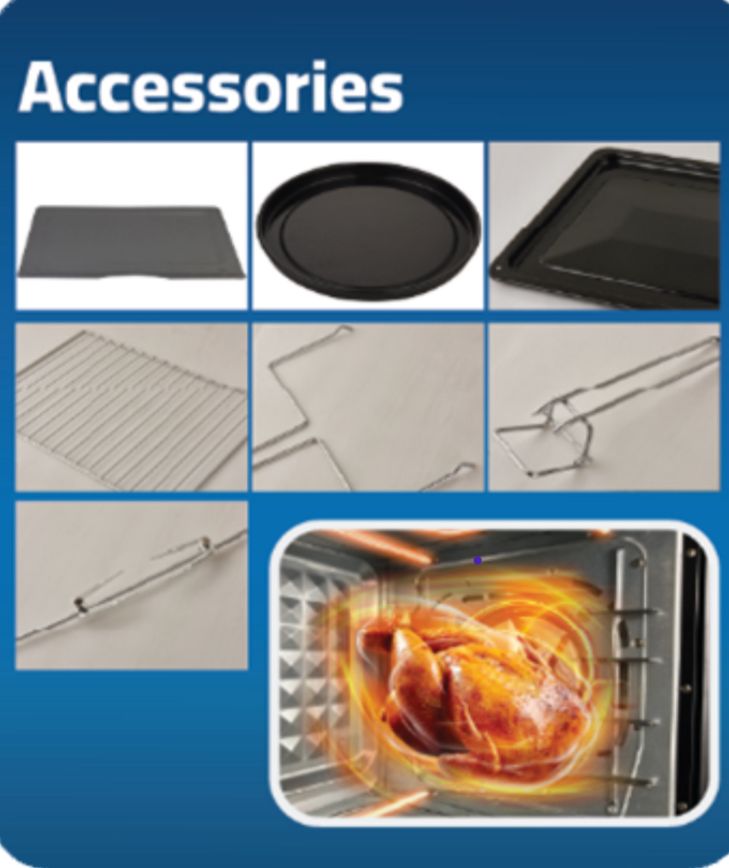 • الباب: نافذة زجاجية كبيرة مزدوجة الطبقات ومقاومة للحرارة، تتيح لك مراقبة الطعام بوضوح أثناء الطهي دون الحاجة لفتح الباب وفقدان الحرارة.